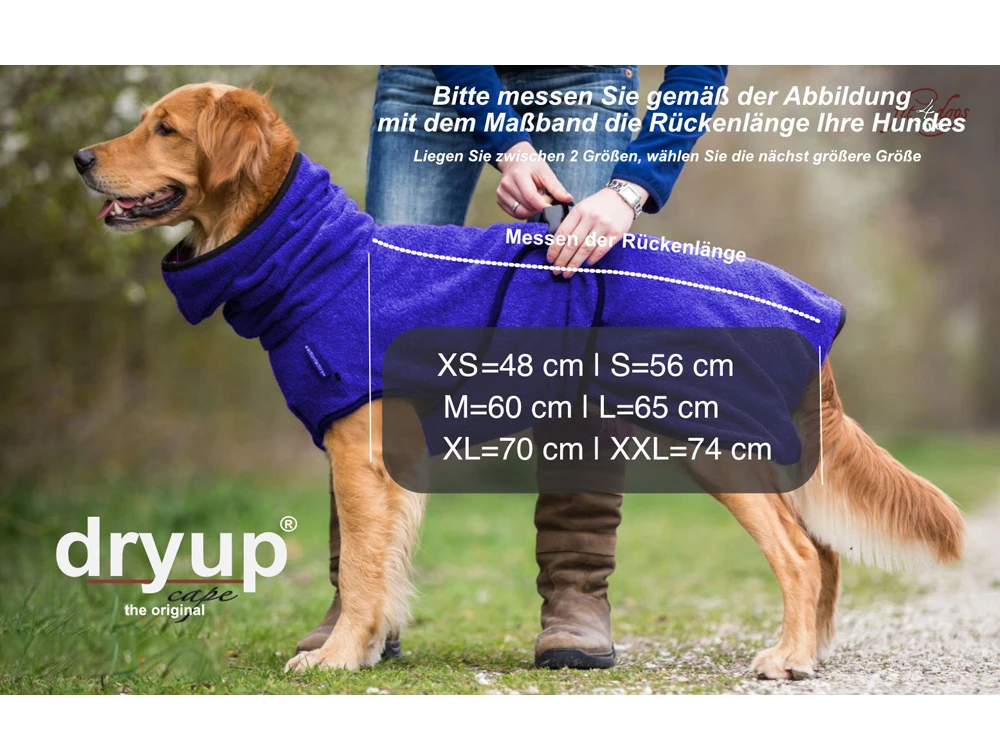 Einfach das Dryup Cape über den Kopf deines Hundes ziehen und dann über den Rücken legen und die Rute durch das dafür vorgesehene Loch am hinteren Ende des Capes ziehen. Anschließend wird die großzügige Bauchabdeckung zwischen den Vorderläufen durchgezogen und mit dem Bauchgurt geschlossen. So trocknet dein Hund angenehm schnell und Schmutz wird im Cape aufgenommen.