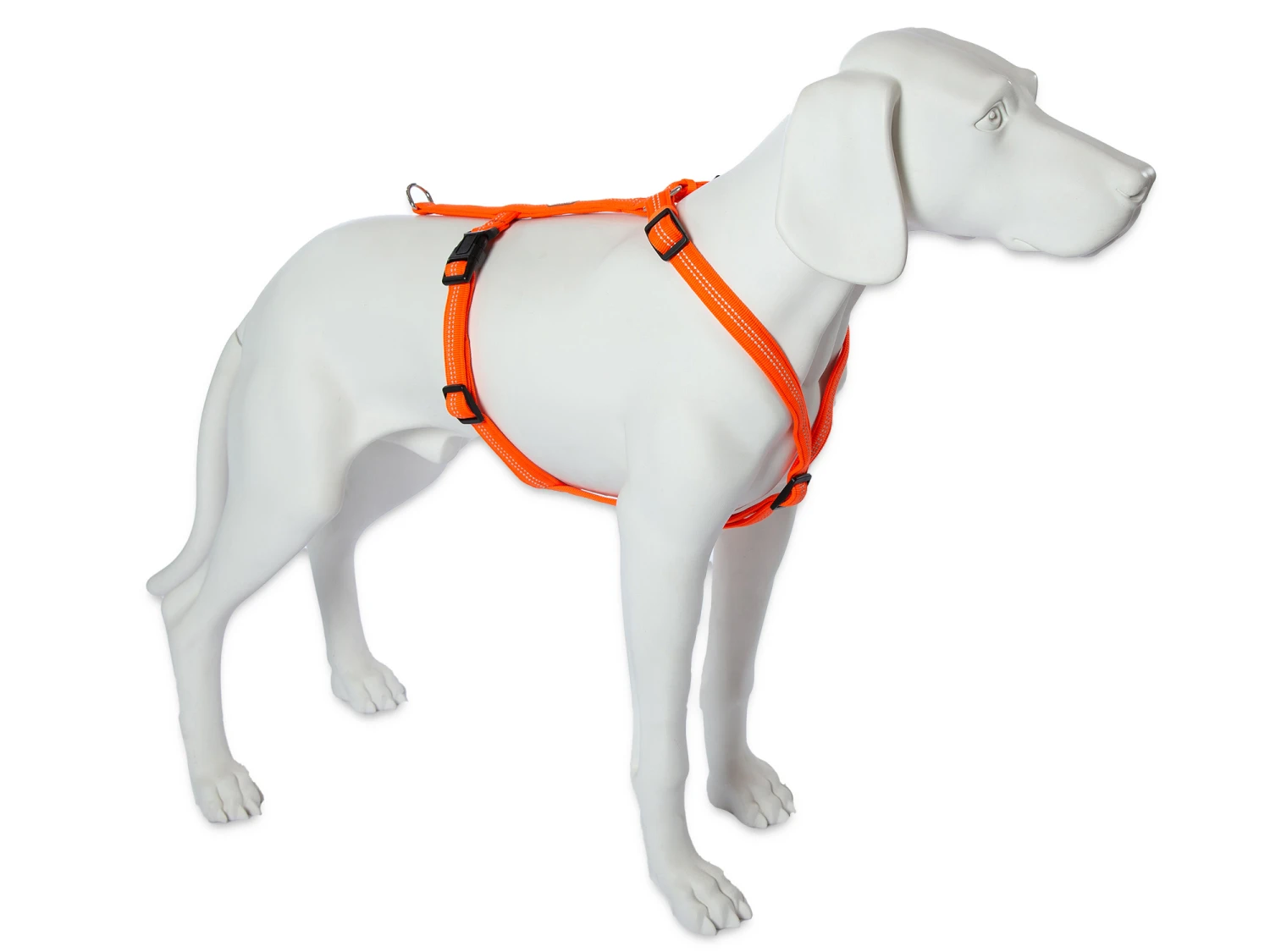 Die gepolsterten und reflektierenden Bänder des Geschirrs in höchster Qualität sind geruchsneutral und langlebig. Die optimale Lage des Bauchgurts garantiert, dass das Geschirr auch unter Zug nicht in den Achseln scheuert. Der Anleinpunkt liegt so weit hinten, dass Dein Hund motiviert nach vorne gehen kann.