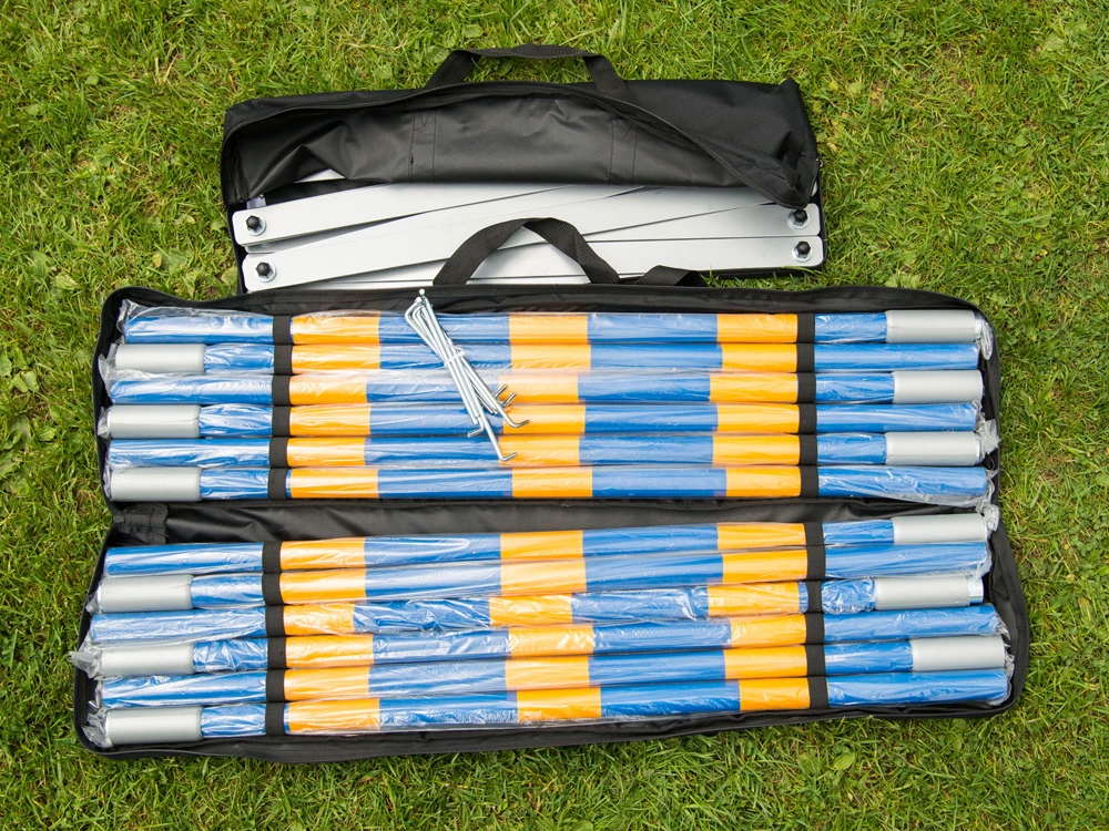 Der Aufbau ist kinderleicht, und transportiert wird der Slalomparcours in 2 mitgelieferten Transporttaschen. Darin ist der Slamom zerlegt und ordentlich verstaut und findet z.B. im Auto sogar hinter dem Beifahrersitz im Fußraum platz.