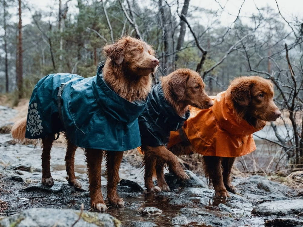 Zusätzlich gibt es eine „Regenrinne“ aus wasserdichtem Trikot rund um den Rand des Halsbandes, das verhindert, dass Wasser in das Fell entlang des Halses des Hundes eindringt. Das angenehm weiche Band kann um den Hals des Hundes gespannt werden, um den Brust- und Halsbereich zu schützen.