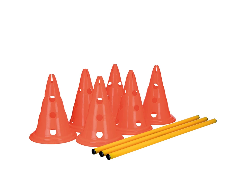 Hierbei kannst du auswählen zwischen 6 Pylonen je ø 23 × 30 cm mit 3 Stangen je 78 cm Länge oder 4 Pylonen je ø 30 × 50 cm mit 2 Stangen je 100 cm.