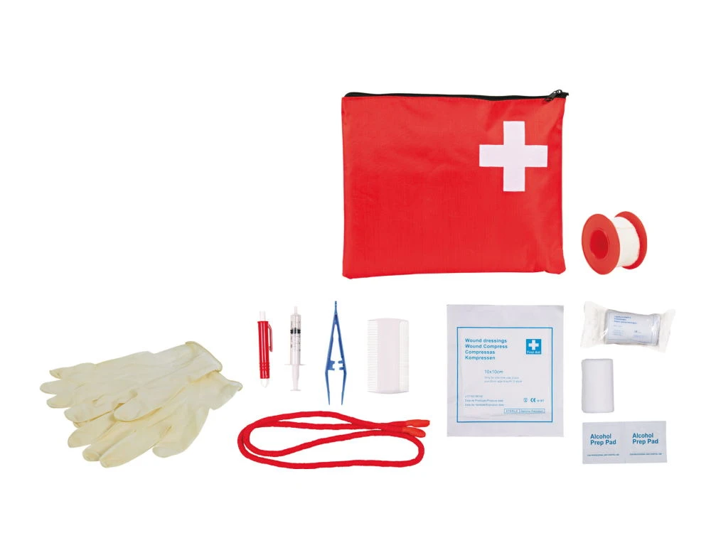 Ausgestattet ist das Set mit 1 Tasche, 1 Wundkompresse, 1 Verbandpäckchen, 1 Fixierbinde, 1 Heftpflasterspule, 2 Alkoholtupfer, 1 Einwegspritze, Plastikpinzette, 1 Paar Vinylhandschuhe, 1 Floh- und Läusekamm, 1 Zeckenzange sowie einer Maulschlaufe. Ein zusätzliches Heft erläutert Notfallsituationen, informiert über das richtige Verhalten des Tierhalters und erklärt die Anwendungsarten der einzelnen Set-Komponenten.