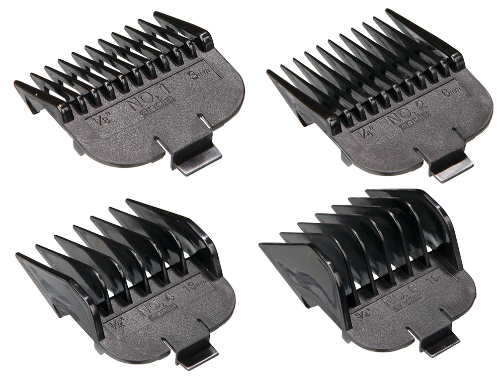 4 Aufsteckkämme gehören zum Set für die Schnittlängen 3, 6, 13 und 19 mm. Mit der ebenfalls enthaltenden Reinigungsbürste hast Du dein Werkzeug nach Gebrauch schnell wieder sauber, das Spezialöl pflegt den Scherkopf, damit Du lange Freude an Deiner Schermaschine hast.